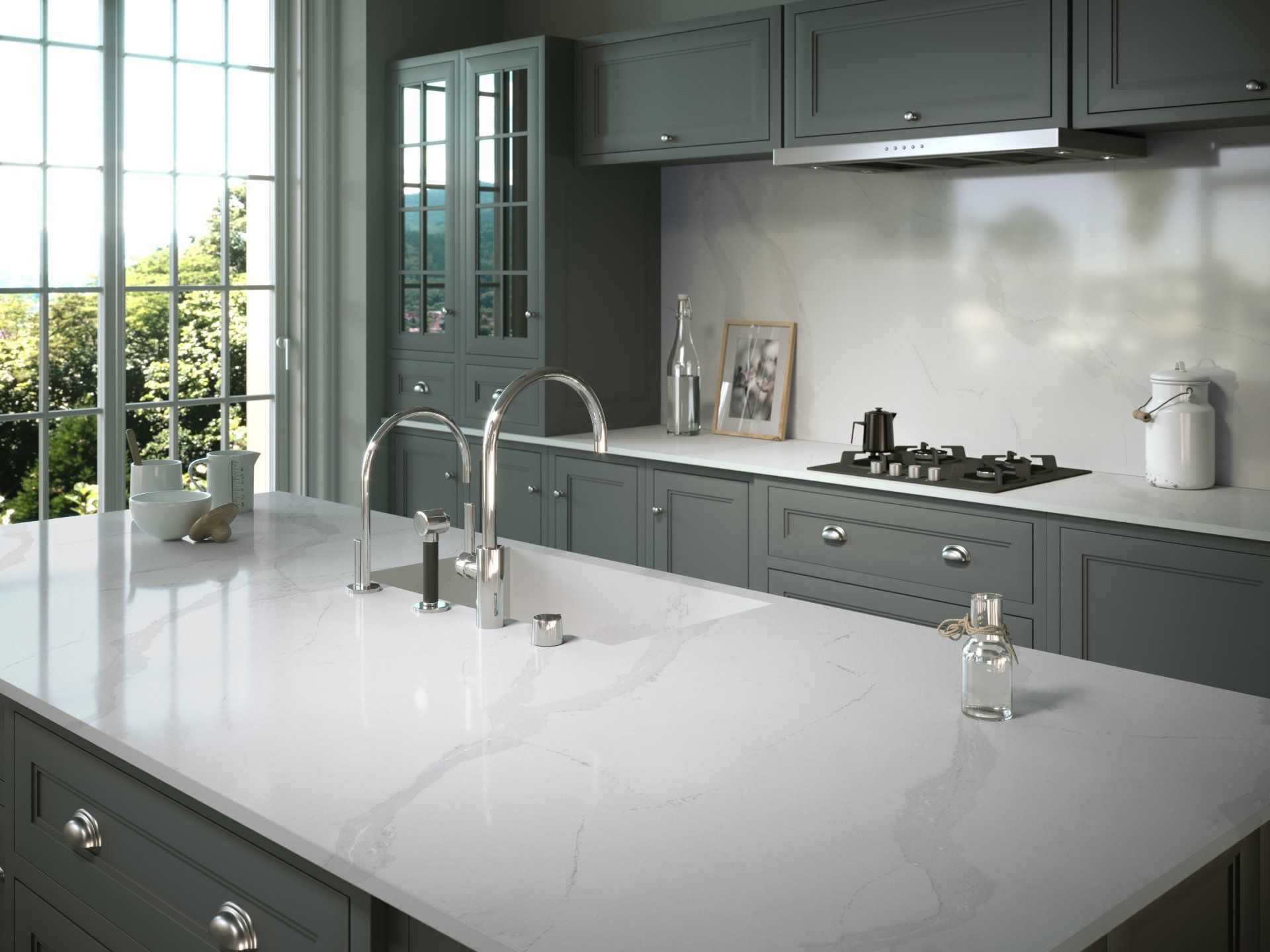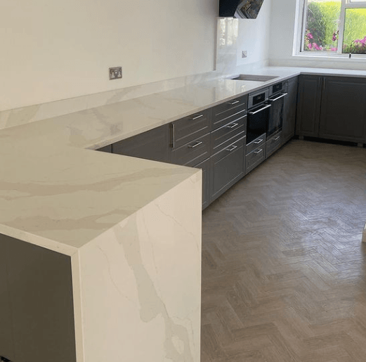 This example is made from Carrara Satinato Quartz and features a breakfast bar and a waterfall edge.